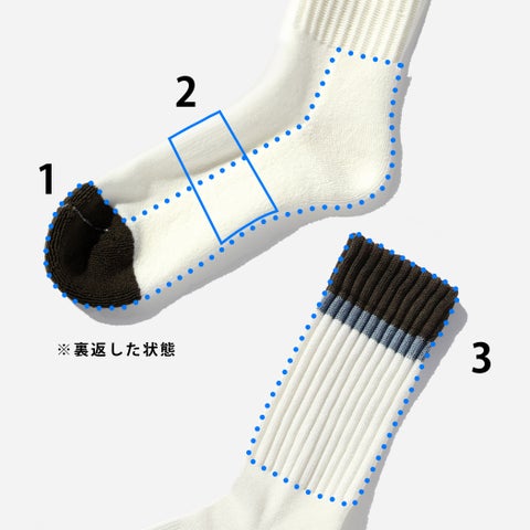 本商品は、カジュアルソックスとしての快適な履き心地にもこだわって作られています。ソックスの足底全体にはパイルが施されており、適度なクッション性を提供します。また、ゆるめのリブ仕様により締め付けすぎず、足首周りの柔らかな履き心地や、たるませて履いた時の雰囲気も楽しめます。