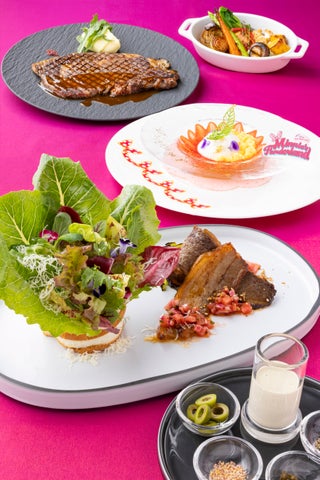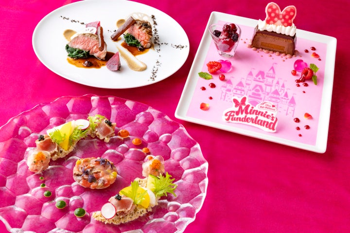 鮪とズワイ蟹、柚子味噌を使った前菜や、アンチョビとカシスのソースを合わせた和牛フィレ肉のグリルなど、本格的な創作料理をお楽しみいただけます。コースのデザートには、ミニーの大好きなドット柄のリボンを乗せたザッハトルテに、さわやかなアサイーを合わせた一皿が用意されます。