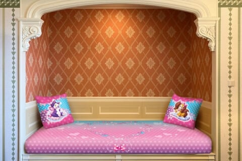 客室の壁のくぼみを使用したアルコーヴベッドには、ミニーが大好きなドット柄がデザインされたベッドカバーや、ミニーと仲良しのフィガロとフィフィが描かれたクッションがあしらわれています。