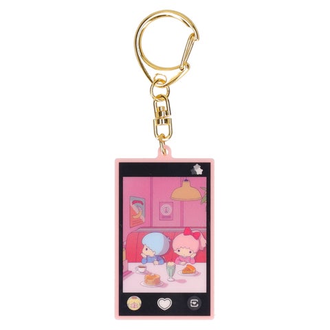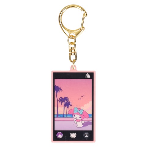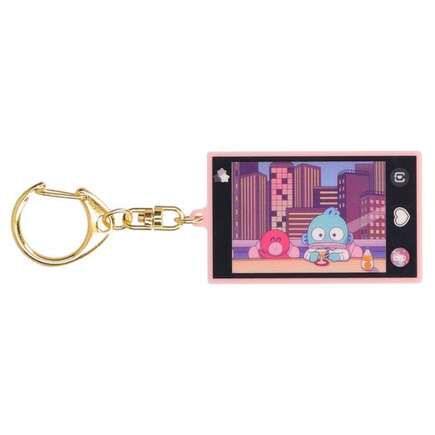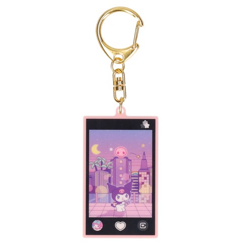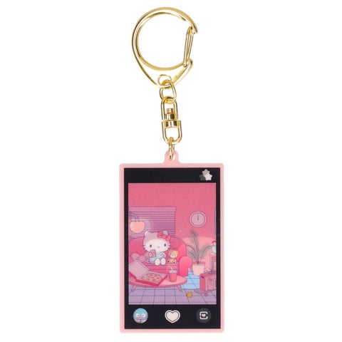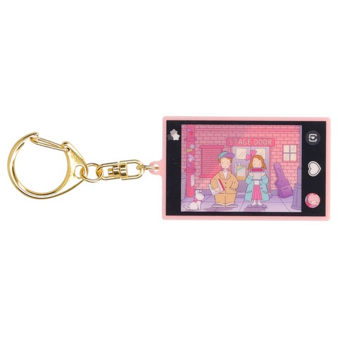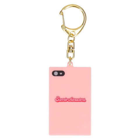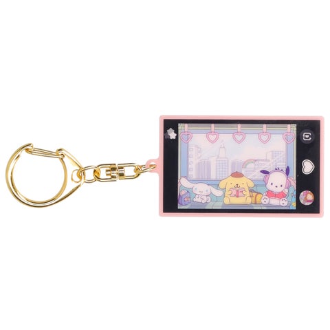 キーホルダーのデザインは、シャッターボタンがハート型になっているほか、サムネイルには一つ前に撮影されたさまざまなキャラクターの写真が配置されています。背面はベビーピンクのスマートフォンケースを模しており、細部にまでこだわったデザインが施されています。