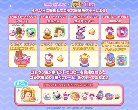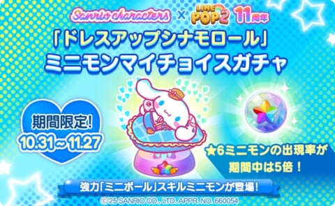 「LINE POP2」の11周年と『サンリオキャラクターズ』とのコラボレーションイベントは、2025年10月31日(金)11:00より開始されます。この機会にゲームをダウンロードし、限定ミニモンや豪華アイテムの獲得を目指してイベントにご参加ください。