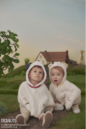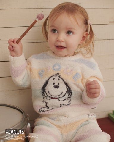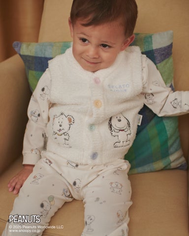 スヌーピーときょうだいたちがカラフルなおもちゃで遊ぶ姿を描いたハッピーな総柄シリーズは、汗をかきやすい子どもにも安心なコットン混素材を使用しています。キッズとベビーで揃えられるため、きょうだいでおそろいコーデも可能です。スタイはロゴ刺繍入りと総柄デザインの2種類があり、ギフトにも適しています。ロンパースと新生児用の2WAYオールは袖と裾が絞ってあり、活発に動いてもめくりあがりにくく、赤ちゃんのデリケートな肌をカバーします。