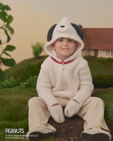 スヌーピーときょうだいのアンディをモチーフにしたニットアイテムは、それぞれのパピーのやわらかな毛並みや個性を表現することに重点が置かれています。スヌーピーはくりくりとカールした毛並みを再現した生地、アンディは少し毛足の長い糸で編み上げたふわふわの生地を使用。顔の表情、立体的な耳付きフード、背中のジャガード模様やしっぽなど、細部にまでこだわったデザインが魅力です。新デザインの袖口には前足をモチーフにしたミトンがプラスされ、実用性も兼ね備えています。