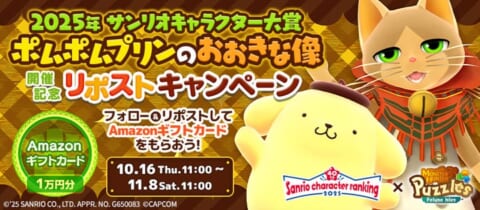 『モンスターハンターパズル アイルーアイランド』にて、2025年11月1日より「2025年サンリオキャラクター大賞 ポムポムプリンをお迎えしよう!」コラボイベントが開催されます。イベントではポムポムプリンを島に迎えられるほか、豪華報酬が手に入ります。また、コラボ記念ログインボーナスやXでのリポストキャンペーンも現在実施中です。