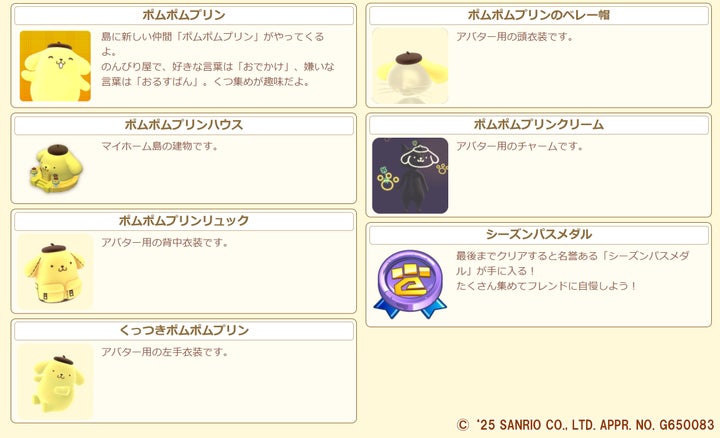 2025年11月1日(土)11:00より、コラボイベント「2025年サンリオキャラクター大賞 ポムポムプリンをお迎えしよう!」が開催されます。本イベントでは、株式会社サンリオの人気投票イベント「2025年サンリオキャラクター大賞」で1位を獲得した「ポムポムプリン」を島に迎え入れることが可能です。さらに、マイホーム島の建物として「ポムポムプリンハウス」などの豪華なイベント報酬も用意されています。