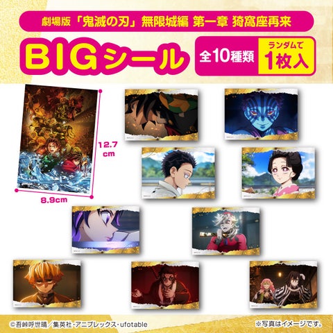 特典として、大迫力のビジュアルやシーンのカットを使用したBIGシールがランダムで1枚付属します。全10種類のシールは、それぞれが名場面を切り取ったデザインとなっており、サイズは12.7×8.9cmと存在感があります。どのシールが手に入るかは開けてからのお楽しみです。