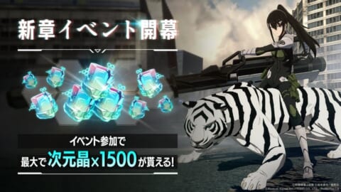 メインストーリー5章の公開を記念した新章イベントが開催中です。メインストーリー5章の進行や、スコアバトルの攻略を通じて、最大で「次元晶を1,500個」獲得できます。詳細はゲーム内の「お知らせ」をご確認ください。