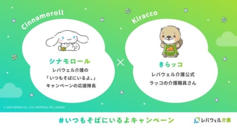 レバウェル株式会社が運営する「レバウェル介護」がサンリオの人気キャラクター「シナモロール」とコラボレーションし、介護従事者応援企画「いつもそばにいるよ。」キャンペーンを開始しました。