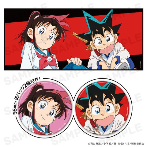 キャラクター「刃 &さやか」がデザインされた大判タオルです。タオル本体に加えて、缶バッジが付属するセット商品として提供されます。