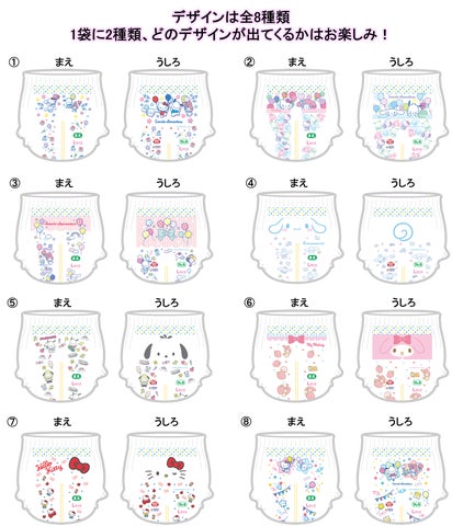 今回の企画品では、世界中で人気の『マイメロディ』、『ハローキティ』、『シナモロール』、『ポチャッコ』の4キャラクターが大きくデザインされています。おむつのデザインは全部で8種類あり、1袋には2種類のデザインが封入。開封時のワクワク感を演出し、親子の楽しいコミュニケーションへと繋がります。