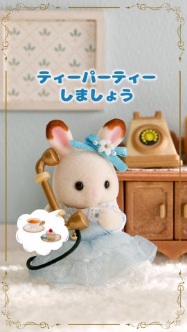 - シルバニアファミリーの人形たちがパーティーに向けておめかしをする様子を描写。