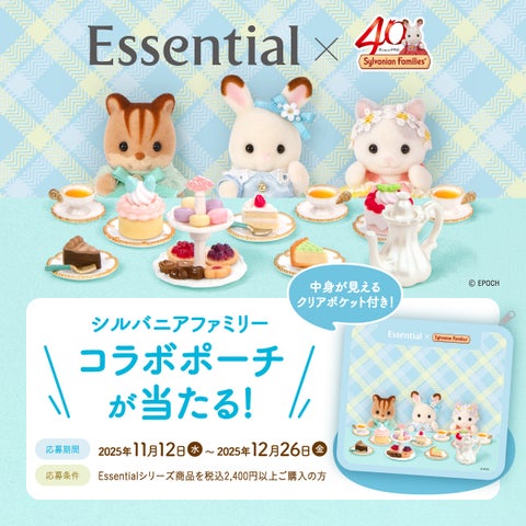 「Essential」シリーズの商品購入者を対象に、「Essential×シルバニアファミリー コラボデザインポーチ」が抽選で100名様に当たるキャンペーンが実施されます。