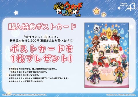 『妖怪ウォッチ ぷにぷに』新商品のみを、1会計2,200円(税込)以上お買い上げごとに、特典としてポストカード(全1種)がプレゼントされます。10周年を記念した限定デザインのポストカードは、ファン必携のコレクターズアイテムです。