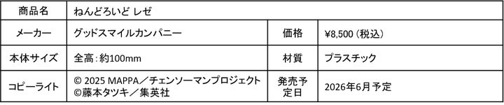 劇場版『チェンソーマン レゼ篇』より、「レゼ」がねんどろいどとして初登場。「笑顔」と「見つめ顔」の表情パーツに加え、「花」などのオプションパーツが付属し、劇中の様々なシーンを再現可能です。