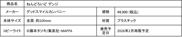 TVアニメ『チェンソーマン』の主人公「デンジ」のねんどろいどが再登場します。「通常顔」と「変身顔」の2種類の表情パーツが付属。変身シーンを再現するための胸のスターターロープや、チェンソーマンに変身した状態の頭部も同梱されています。変身後の頭部は顎の可動ギミックと脱着可能なベロパーツ、さらにチェンソーに変わった腕と組み合わせることで、原作中の活躍を再現できます。相棒の「ポチタ」も可愛らしく立体化され付属します。