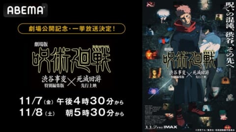 『劇場版 呪術廻戦「渋谷事変 特別編集版」×「死滅回游 先行上映」』の公開を記念し、ABEMAにてTVアニメ『呪術廻戦』第2期「懐玉・玉折/渋谷事変」の全話一挙無料放送が決定いたしました。さらに、期間限定でスペシャルパフォーマンス映像も公開されます。