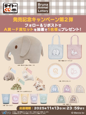 「タイトーくじ ブルーナアニマル Gingham Check Collection」の発売を記念して、「A賞~F賞セット」が抽選で1名にプレゼントされるキャンペーンが実施されます。