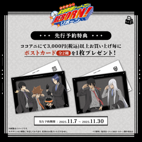 ECサイト「ココアニ」にて、先行予約期間中に本記事で紹介されている対象商品を1会計3,000円(税込)以上購入ごとに、「ポストカード(全2種)」がランダムで1枚プレゼントされます。この機会を逃さず、特典を手に入れることを推奨いたします。
