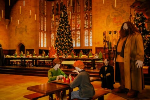 また、大広間には映画『ハリー・ポッターと賢者の石』の印象的なシーンより、魔法のチェスをするハリーとロンの姿が再現されています。華やかな装飾の中で、どこか温かく穏やかな時間が流れる冬の日の様子が切り取られた空間です。
