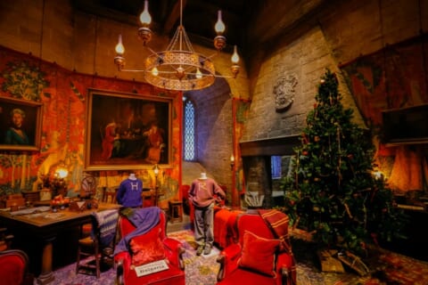 ハリーたちが学生生活を送ったグリフィンドールの男子寮と談話室も、期間限定でクリスマス仕様となります。ツリーが飾られ、温もりが感じられる空間に。寮のテーマカラーである赤を基調とした室内には、ロンの母の手編みのセーター姿のハリーとロンの姿も見受けられ、映画『ハリー・ポッターと賢者の石』で描かれたクリスマスの朝のシーンを思わせる温かな空間が作られています。