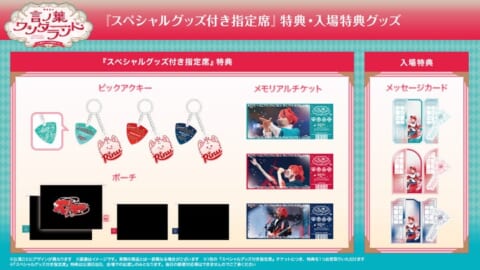 『スペシャルグッズ付き指定席』の特典は公演ごとにデザインが異なり、チケット1枚につき特典を1つ受け取れます。特典は公演当日、会場での受け渡しのみとなり、後日の郵送対応はできません。