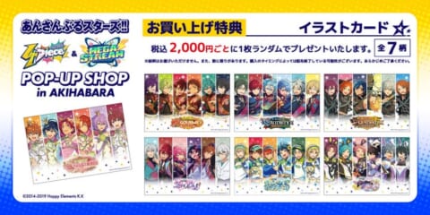 「TOPPA!!! BASE AKIBA」オリジナルグッズを1会計につき税込2,000円購入するごとに、各イベントに登場したアイドルが横並びに配置されたデザインのイラストカード(全7種)がランダムで1枚配布されます。この購入特典は、オンラインでの購入やアニメイト店舗での予約購入の場合も、商品配送時もしくは引取時に配布されます。特典は在庫がなくなり次第終了となりますのでご注意ください。
