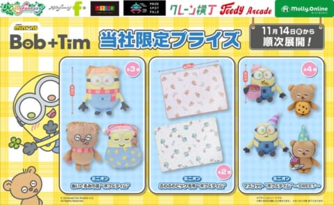 株式会社イオンファンタジーは、イルミネーションの大人気アニメーション映画「怪盗グルー/ミニオンズ」シリーズのキャラクター「ボブ+ティム」のプライズゲーム用景品3アイテムを、全国の「モーリーファンタジー」「PALO」をはじめとするアミューズメント施設にて展開します。