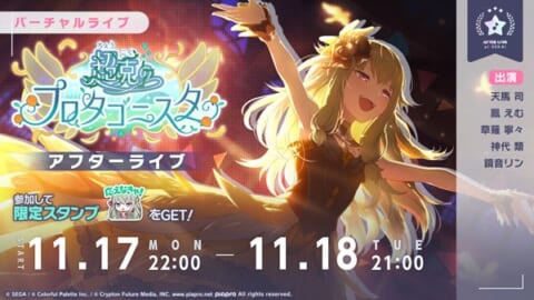 イベント終了後には、バーチャルライブ形式の「超克のプロタゴニスタ アフターライブ」が開催されます。ライブは2025年11月17日(月)22:00から、翌11月18日(火)21:00まで毎時開催され、約15分間上演されます。