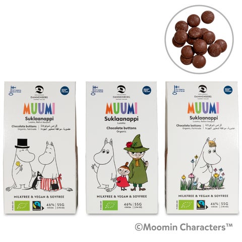 Dammenberg(ダンメンベルグ)は、1994年にフィンランド・レンペーラで創業した家族経営のチョコレート工房です。有機原料とフェアトレードを基盤とし、アレルギーや食事制限がある方にも安心して楽しめるチョコレートづくりに注力しています。「食の制限があっても、同じテーブルで一緒に楽しめるチョコレートを」という哲学のもと、ムーミンデザインシリーズを世界に輸出しています。