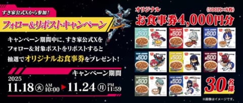 すき家公式X(旧Twitter)では、フォロー&リポストキャンペーンが開催されます。参加者の中から抽選で30名にオリジナルお食事券4,000円分(500円×8枚)が当たります。