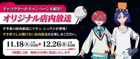 キャンペーン期間中、すき家店舗にて『機動戦士Gundam GQuuuuuuX』のキャラクターによるオリジナル店内放送を聞くことができます。マチュとシュウジがキャンペーン内容を紹介する、録り下ろしボイスをぜひお楽しみください。