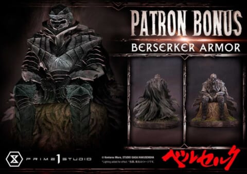 本製品には、コアなファンに向けてパトロンボーナスパーツが用意されています。プライム1スタジオ公式サイトにて本製品と対象製品のいずれか1体をご購入いただいた方には、「狂戦士の甲冑(着用前)」がプレゼントされます。これは祠で運命を待つ姿のディスプレイモデルであり、作品の世界観をさらに深めることができる特典です。