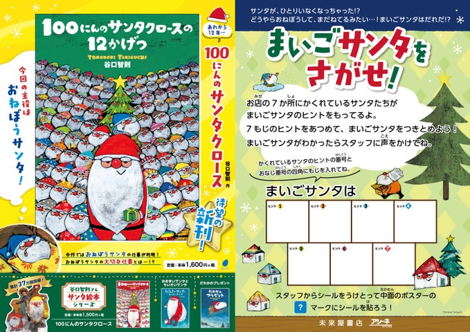 株式会社未来屋書店は、絵本作家・谷口智則氏の人気絵本「100にんのサンタクロース」とのコラボレーションによるクリスマスフェアを全国の未来屋書店で開催します。