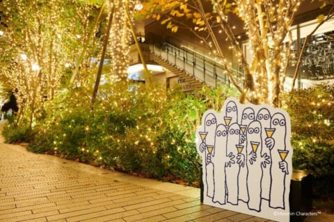 各イルミネーションエリアには、約60匹のニョロニョロが描かれた「ニョロニョロ発生スポット」も登場しています。全4種類のデザインがあり、ニョロニョロが帽子の周りに集まったり、カクテルを持ったりする様子が描かれ、来場者をムーミンの物語の世界へ誘います。幻想的なイルミネーションとともに、散策しながら「ニョロニョロ発生スポット」を巡る楽しみも提供されます。