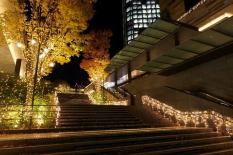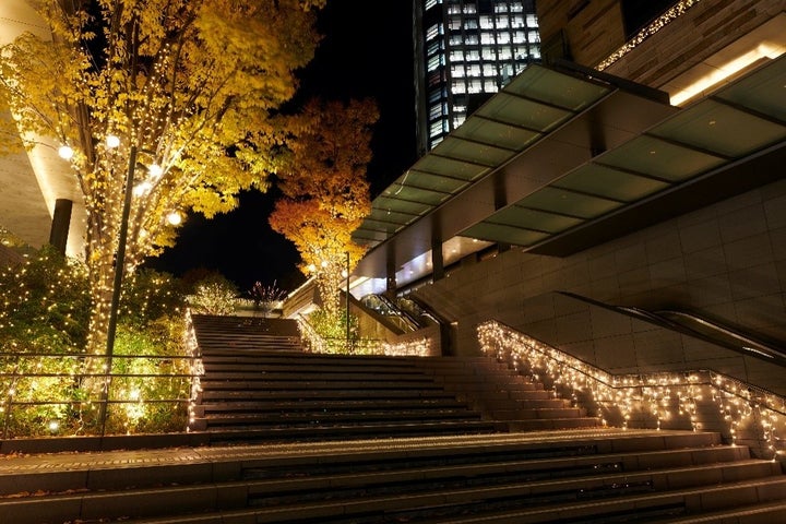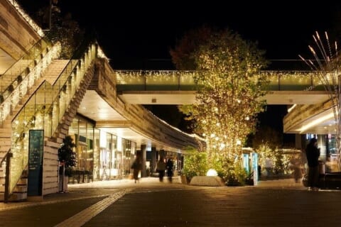 屋外各所では、シャンパンゴールドの柔らかい光に包まれる約6.4万球のLEDライトで彩るウィンターイルミネーションが点灯しています。二子玉川ライズ リボンストリート、オークモール、バーズモール、大階段が温かな光で満たされる空間です。