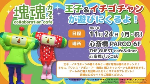 大阪・心斎橋PARCOにて期間限定で開催中の「塊魂 Collaboration Cafe」では、2025年11月24日(月・祝)に王子とイチゴチャンの着ぐるみグリーティングイベントが開催されます。ゲームの世界観を体験できるオリジナルメニューや限定グッズが提供されており、SNS映えする店内装飾も魅力です。