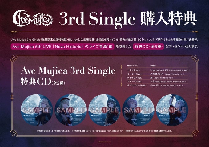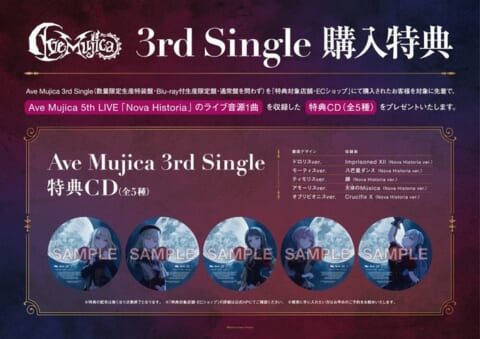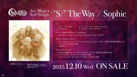 Ave Mujicaの3rd Single「‘S/’ The Way / Sophie」が、2025年12月10日(水)にリリースされます。数量限定生産特装盤・Blu-ray付生産限定盤には、今年7月に開催されたAve Mujica 5th LIVE「Nova Historia」DAY1/DAY2の映像が収録される予定です。