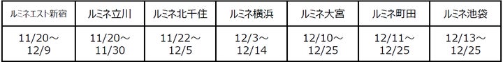 ルミネ新宿、ルミネエスト新宿、ルミネ北千住、ルミネ池袋、ルミネ立川、ルミネ町田、ルミネ荻窪、ルミネ大宮、ルミネ横浜、大船ルミネウィング