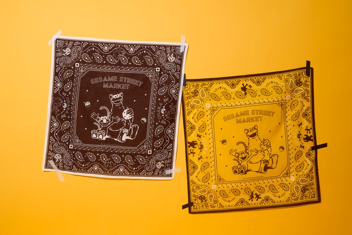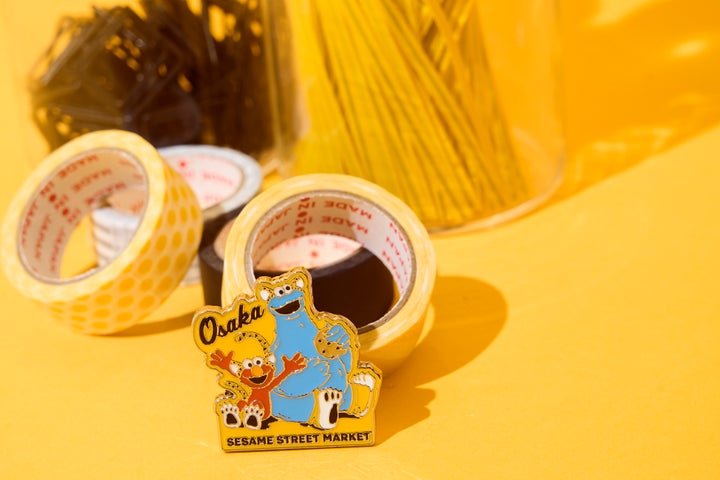 トラのコスチューム姿のエルモとクッキーモンスター、たこ焼きなど、大阪ならではのモチーフを詰め込んだデザインです。首元やバッグへのアレンジ、インテリアとしても活用できます。
