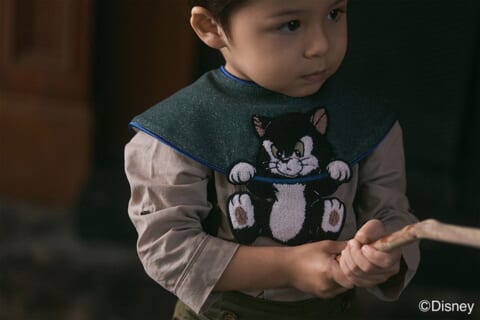 - ディズニー『ピノキオ』から、仲良しの「フィガロ」と「クレオ」がモチーフ。スタイにぶら下がるユーモアあふれる姿が立体感のある刺しゅうで表現されています。