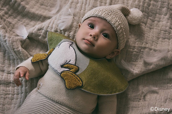- お尻を出した「ドナルドダック」のお茶目な仕草が描かれたスタイ。対面には元気に手を振る姿がデザインされており、さまざまな表情を楽しめます。