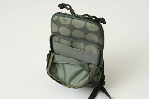外側:前面ファスナーポケット×1(内部にオープンポケット×2)、背面オープンポケット×1