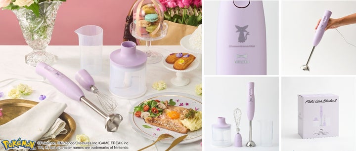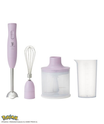 エーフィがデザインされた特別なパープルカラーのマルチスティックブレンダーです。つぶす・混ぜる・刻む・砕く・泡立てるの1台5役で、料理からカフェメニューまで幅広く対応します。電子レンジ対応のチョッパーボトルとブレンダーカップが付属し、下ごしらえから加熱調理まで可能です。食洗機対応(一部パーツ)でお手入れも容易な点も特徴です。