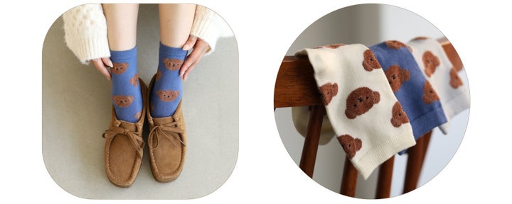 かかとの上でミッフィーが頬杖をついたようなデザインのソックスです。毛混素材でふんわりと暖かな履き心地が特徴。