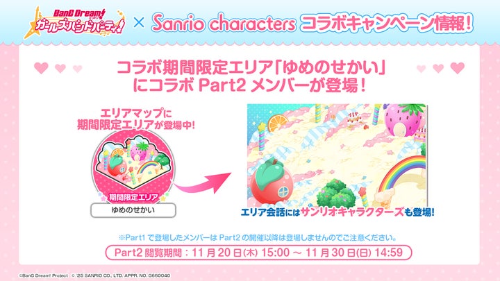 2025年11月20日(木)15時より、コラボ期間限定エリア「ゆめのせかい」にコラボPart2のメンバーが登場します。この限定エリアでは、ガルパメンバーとサンリオキャラクターズがお話ししている様子を見ることができ、Part2の閲覧期間は2025年11月20日(木)15時から2025年11月30日(日)14時59分までです。