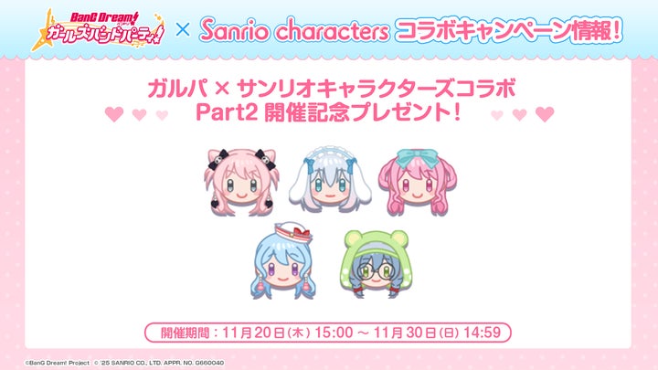 「バンドリ! ガールズバンドパーティ!」は、サンリオキャラクターズとのコラボPart2を2025年11月20日(木)15時より開催することを発表しました。新たなゲーム内イベント、コラボ楽曲の追加、そして複数の開催記念キャンペーンが展開されます。