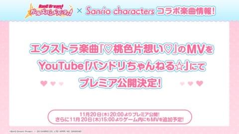 エクストラ楽曲『♡桃色片想い♡』のMVは、YouTube「バンドリちゃんねる☆」にてプレミア公開されます。