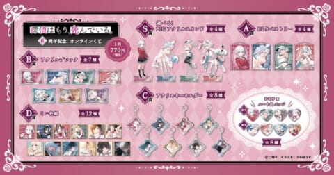 今回のオンラインくじでは、『探偵はもう、死んでいる。』の6周年を記念し、過去のフェア描き下ろしイラストなどを使用したオリジナルグッズが多数ラインナップされています。