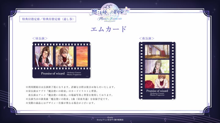 エムカードに収録される楽曲「魔法使いの約束」は昼夜共通で、利用開始日は公演終了後となります。特典付指定席のイラストカード(6枚セット)のデザインは、昼公演と夜公演で異なります。