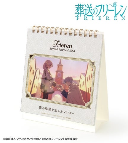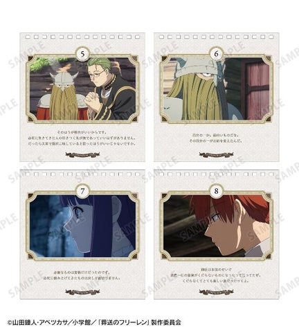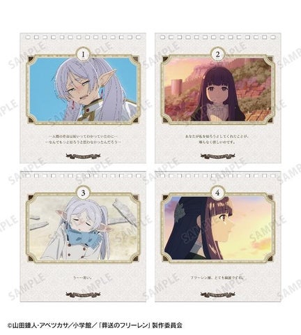 フリーレン、フェルン、シュタルク、ヒンメル、ハイター、アイゼン、ザインの印象的なシーンを日替わりで楽しめる日めくりカレンダーです。作中の台詞と話数が組み合わせてデザインされており、1~31までの数字が入っているため、年月が経過しても使用できるリングタイプの卓上カレンダーとして、お部屋やデスク周りに飾ることができます。